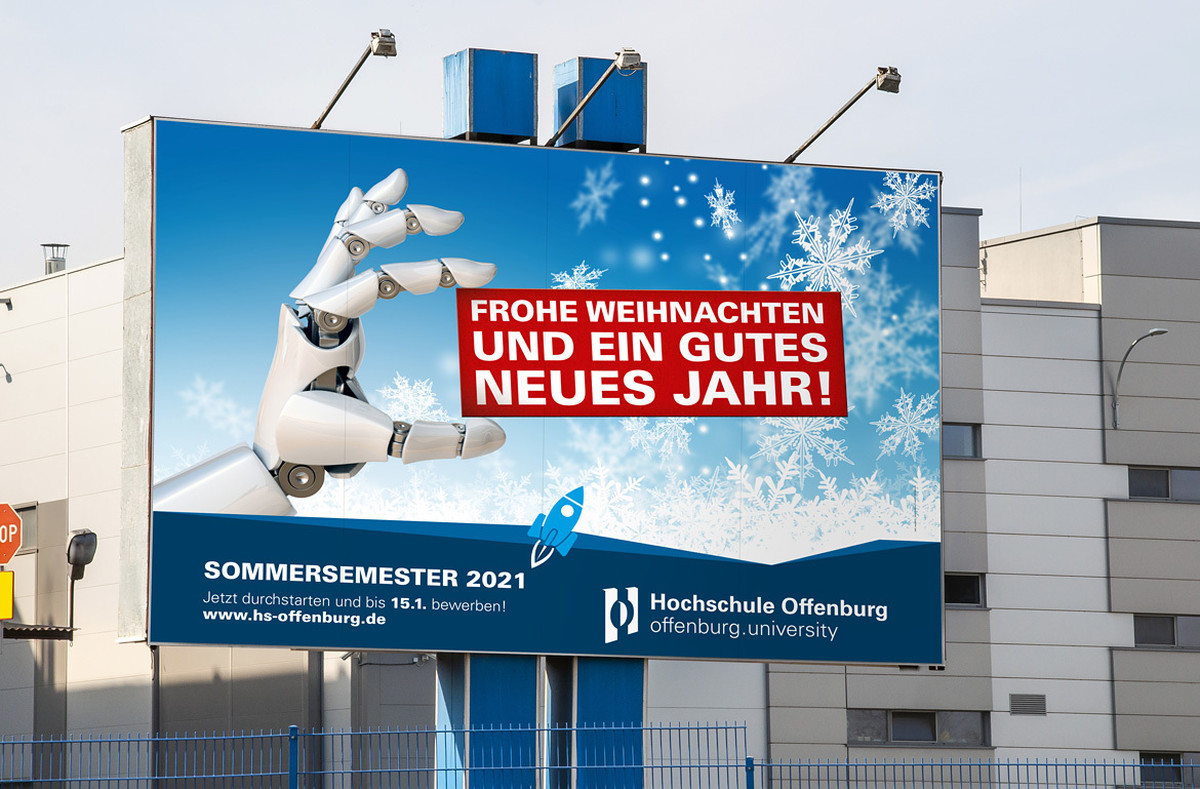 Für die Hochschule Offenburg haben wir kurz vor dem Fest dieses 18/1-Plakat entworfen, so dass es noch rechtzeitig auf dem Weg zum Campus installiert werden und die Pendler und Bewohner der Stadt für Weihnachten und Neujahr gegrüßt werden konnten.